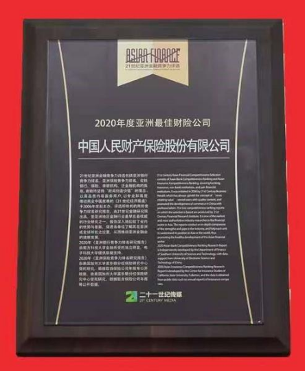 2020年11月11日,《2020亚洲保险公司竞争力研究报告》在京发布,并揭晓“21世纪亚洲金融竞争力评选榜单”,公司再度获评“2020年度亚洲最佳财险公司”称号,成为业界唯一一家连续12年蝉联“亚洲保险竞争力”排名第一的非寿险公司。