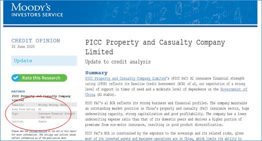 2020年6月,穆迪投资者服务公司确认将2020年公司信用评级维持在A1(展望稳定),与中国主权信用评级保持一致,为国内保险公司最高水平。