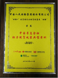 2020年11月12日,人民日报社、中国银行业协会、中国保险业协会、国家金融与发展实验室、中国银行保险报联合发布“中国普惠金融典型案例(2020)”,公司“‘保险+’扶贫模式让脱贫致富更‘保险’”案例,荣获“中国普惠金融助力脱贫攻坚典型案例”奖。