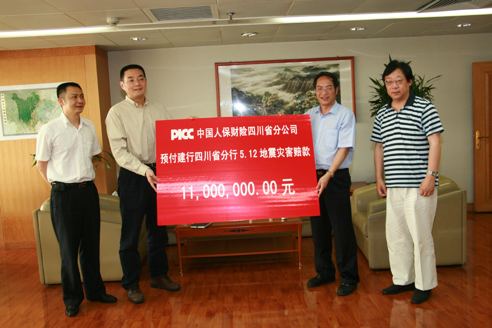 5月26日,中国人保集团人保财险四川省分公司总经理陈显宜将一张1100万元的企财险预付赔款支票交到中国建设银行四川省分行杨丰来副行长手中,积极支持建行震区受损营业网点恢复营业。据了解,这是“5.12”汶川地震发生以来单个保险企业支付的最大一笔保险预赔款。