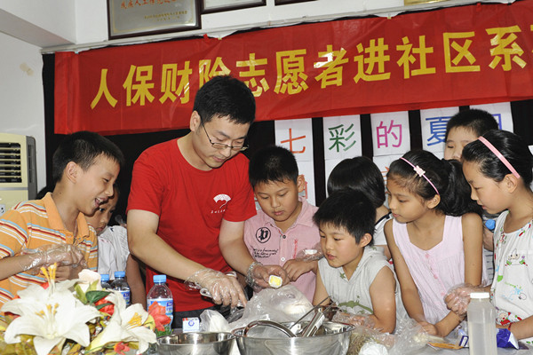 朱熙、肖宇和张一旻是活跃在人保志愿者团队里的三个25、6岁的热情满满的年轻人。这三个戴着眼镜长得白净的家伙,外表文静内心火热。朱熙曾经是一名大学生西部计划的志愿者,在陕西参与过志愿者工作,做起事来有一股专注和投入的韧劲。而肖宇是一个活泼的童心细腻的女孩,张一旻则有一手捉襟见肘的小魔术,他们的组合总是会给社区的孩子带来欢乐。