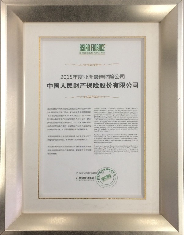 2015年11月27-28日,21世纪亚洲金融年会暨2015亚洲银行∕保险竞争力排名研究报告发布仪式在京举行。中国人民财产保险股份有限公司(简称“中国人保财险”)在2015年“亚洲保险竞争力排名”中名列榜首,荣获“2015年度亚洲最佳财险公司”大奖。