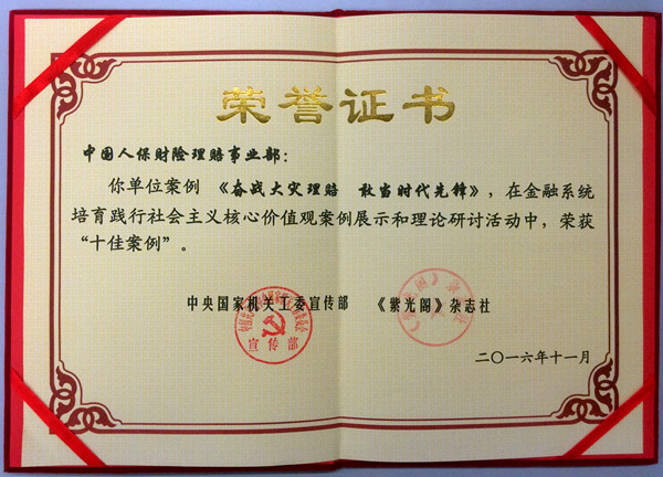 11月29日,在中央国家机关工作委员会召开的中央金融机构培育践行社会主义核心价值观案例展示会上,中国人保财险典型案例《奋战大灾理赔 敢当时代先锋》获评“十佳案例”,受到中央国家机关工委和中央文明办的隆重表彰。中国人保财险是保险行业唯一获此殊荣的单位,获奖案例刊发在中共中央国家机关工作委员会主管的期刊《紫光阁》上。