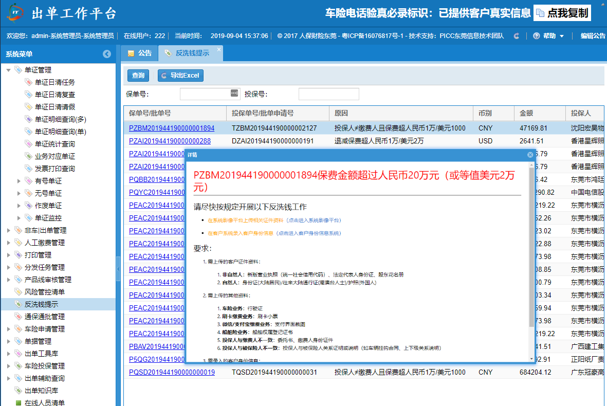 为加强经营单位反洗钱工作,提升反洗钱工作效率,人保财险广东省东莞市分公司经过多轮测试,其自主研发的“反洗钱承保小助手”平台于2019年9月份成功上线试运行。